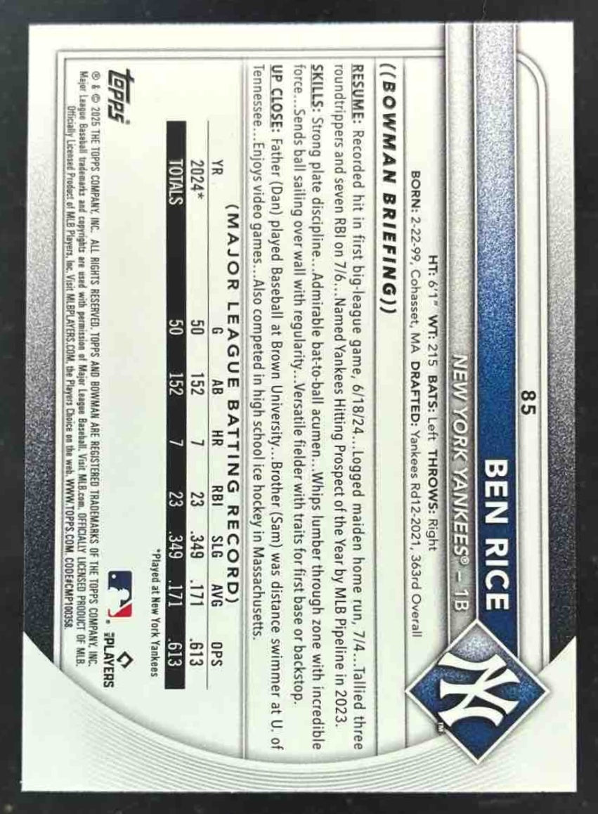 2025 Bowman Green Pattern Border #85 Ben Rice RC /99