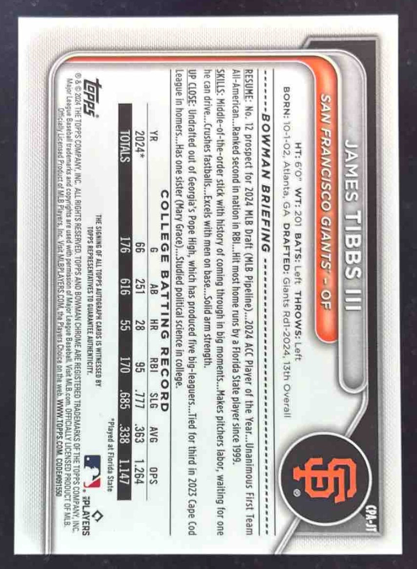 2024 Bowman Draft Chrome Autographs #CPA-JT James Tibbs III RC Auto