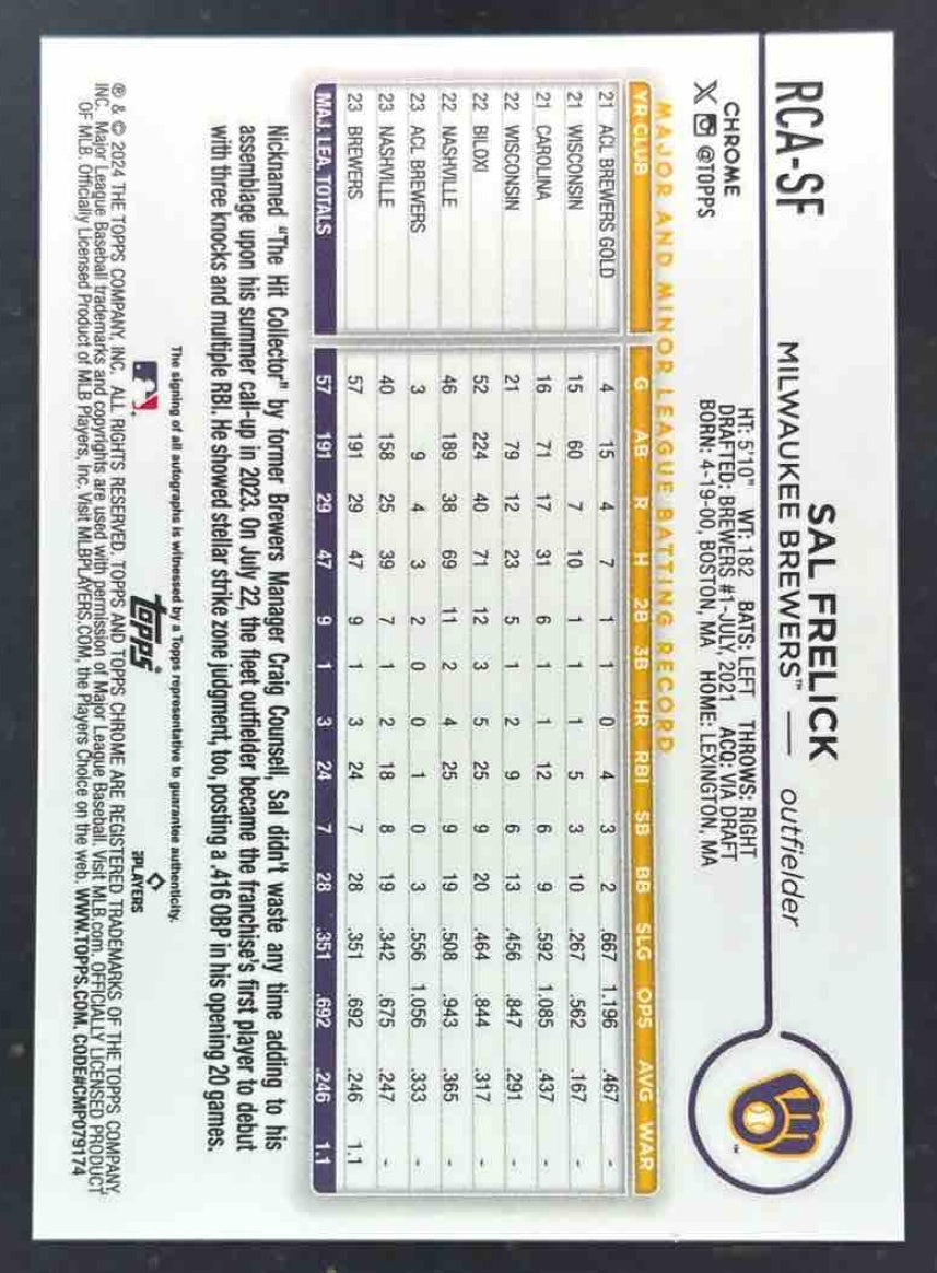 2024 Topps Chrome Logofractor MLB Refractor #RCA-SF Sal Frelick RC Auto