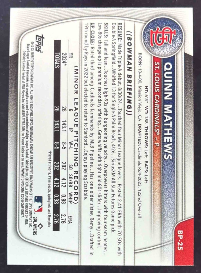 2025 Bowman Prospects Bowman Retro Logo Foil Pattern #BP-25 Quinn Mathews RC