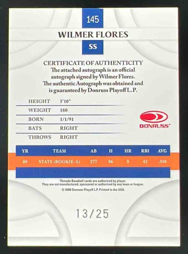 2008 Donruss Threads Signatures Gold #145 Wilmer Flores RC Auto /25