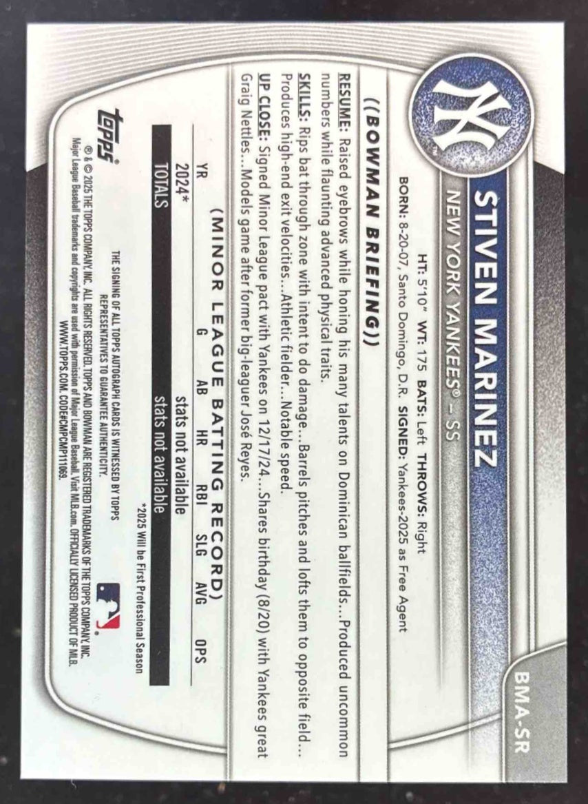 2025 Bowman Chrome Mega Box Purple Mojo #BMA-SR Stiven Marinez RC Auto /199