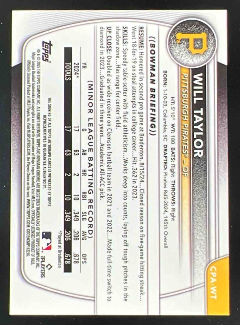 2025 Bowman Chrome Autograph Green Lava Refractor #CPAWT Will Taylor RC Auto /99