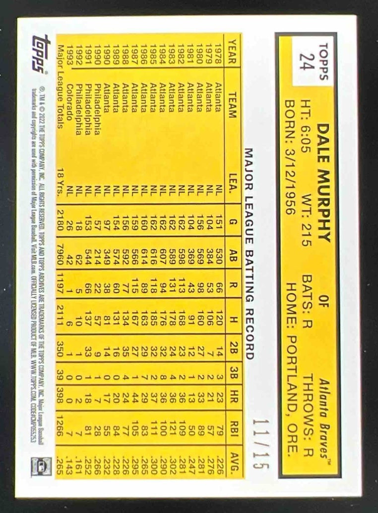 2022 Topps Archives Orange Hot Foil #24 Dale Murphy /15