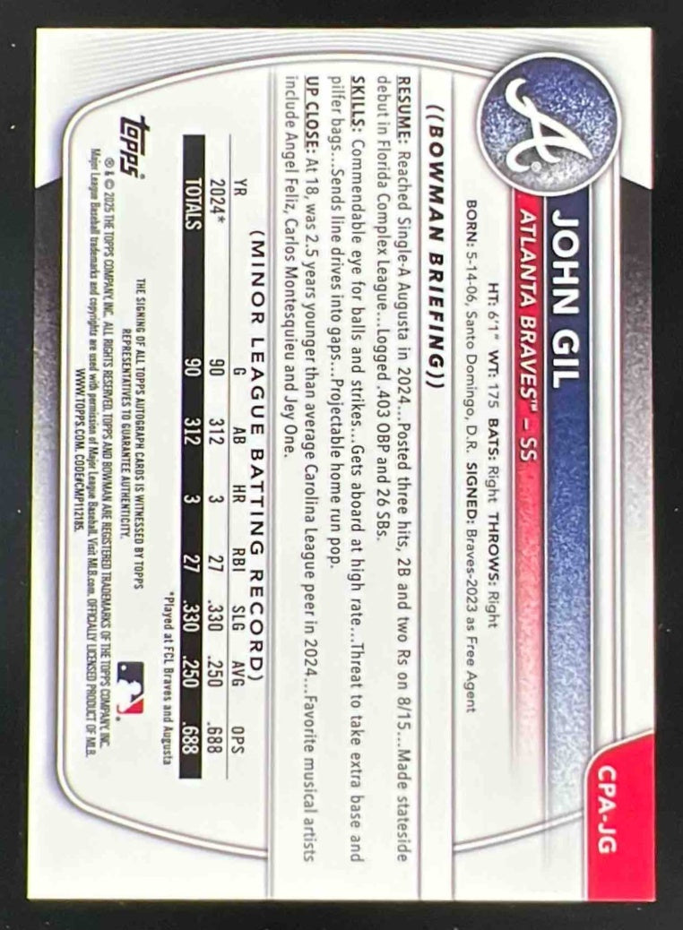 2025 Bowman Chrome Autograph Reptilian Blue Refractor #JG John Gil RC Auto /150