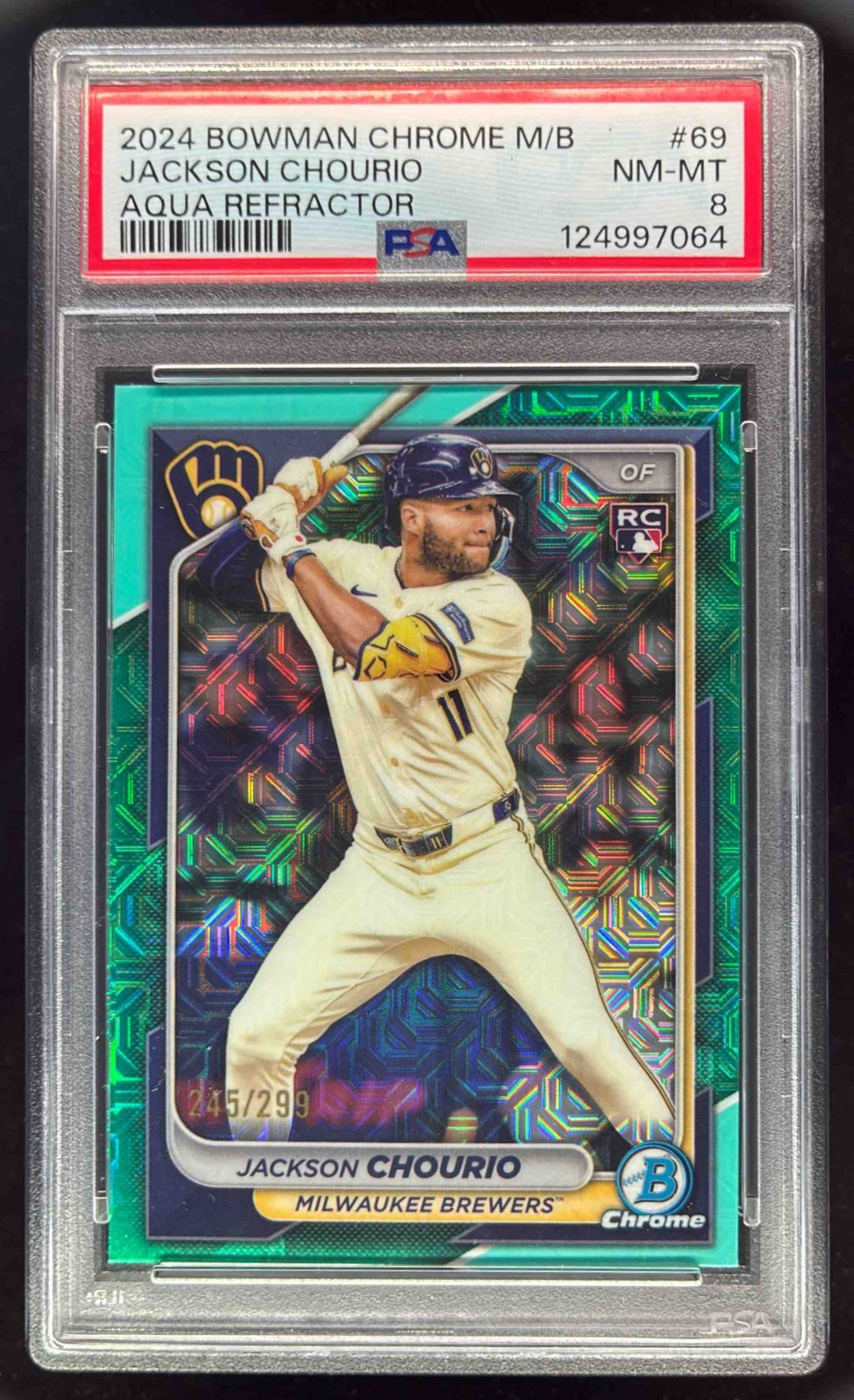 2024 Bowman Chrome Mega Box Aqua Refractor #69 Jackson Chourio RC /299 PSA 8