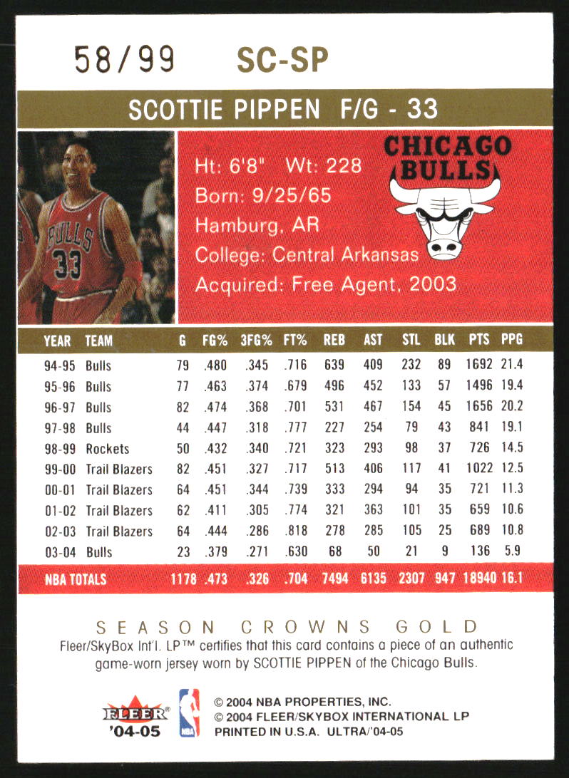 2004-05 Ultra Season Crowns Game Used 99 #SP Scottie Pippen /99