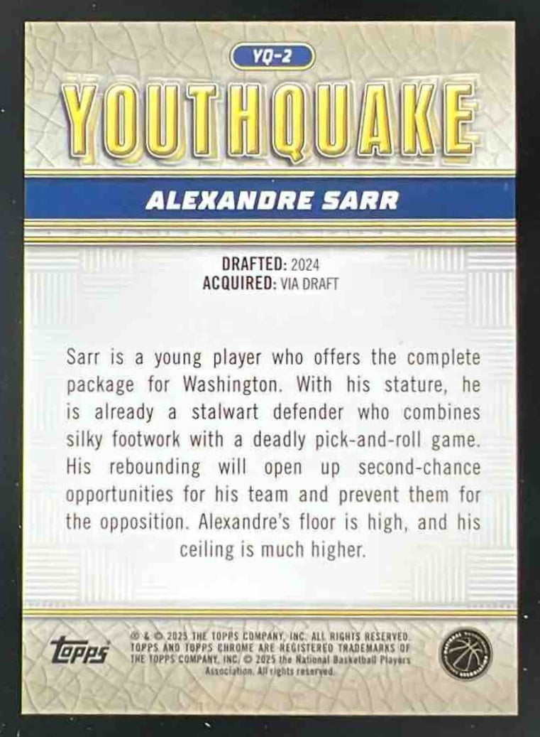 2024-25 Topps Chrome YouthQuake Orange Refractor #YQ-2 Alexandre Sarr RC /25