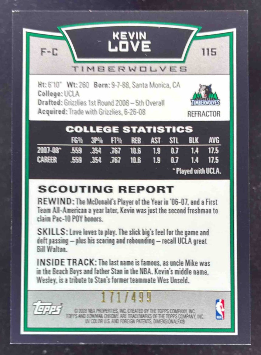 2008-09 Bowman Chrome Refractors #115 Kevin Love RC /499