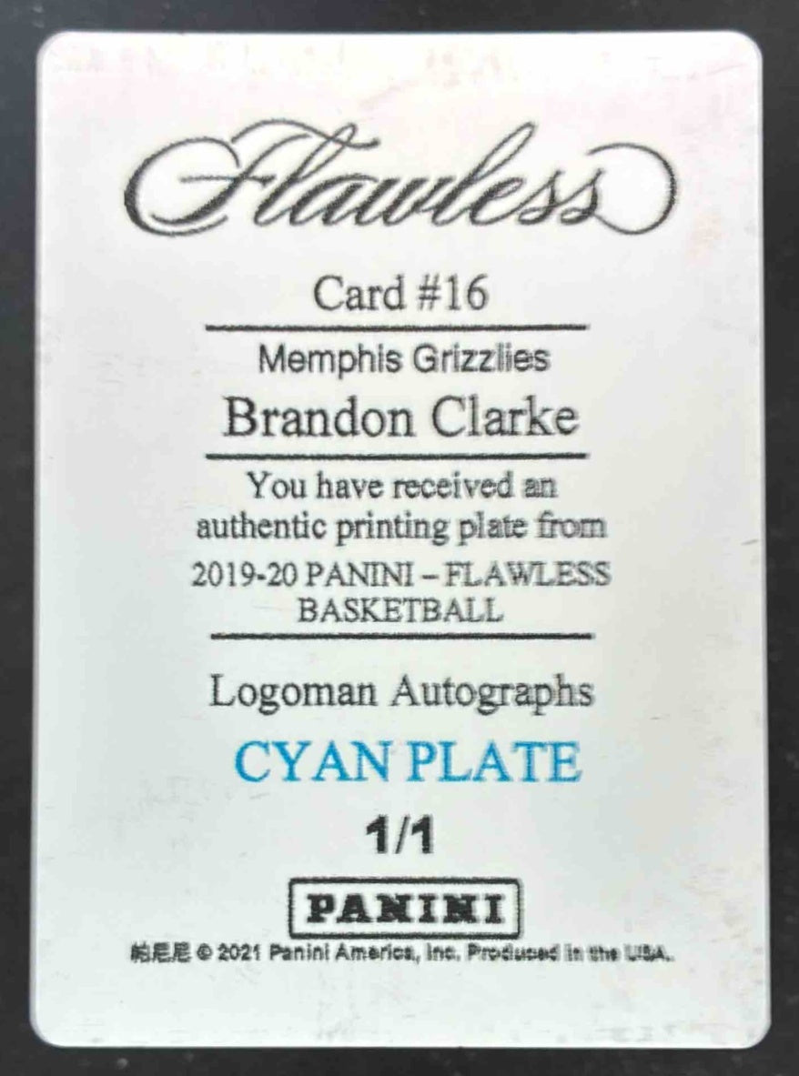 2019-20 Panini Flawless Printing Plate Cyan #16 Brandon Clarke RC 1/1