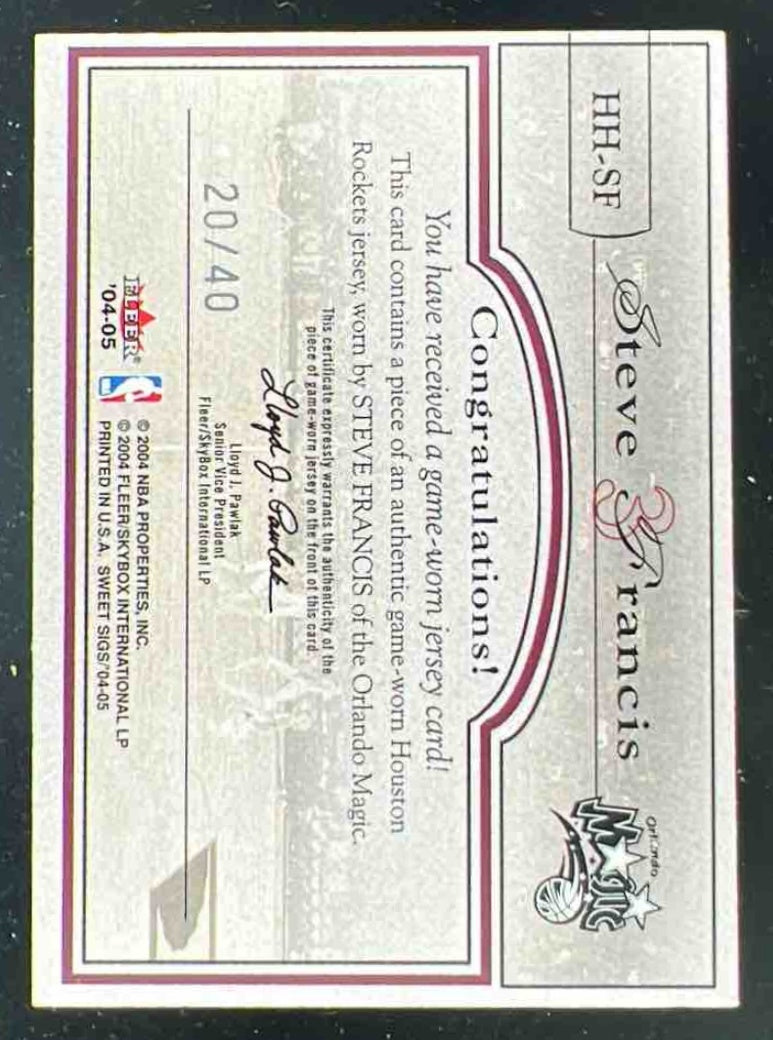 2004-05 Fleer Sweet Sigs Hardcourt Heroics Jerseys #HH-SF Steve Francis /40