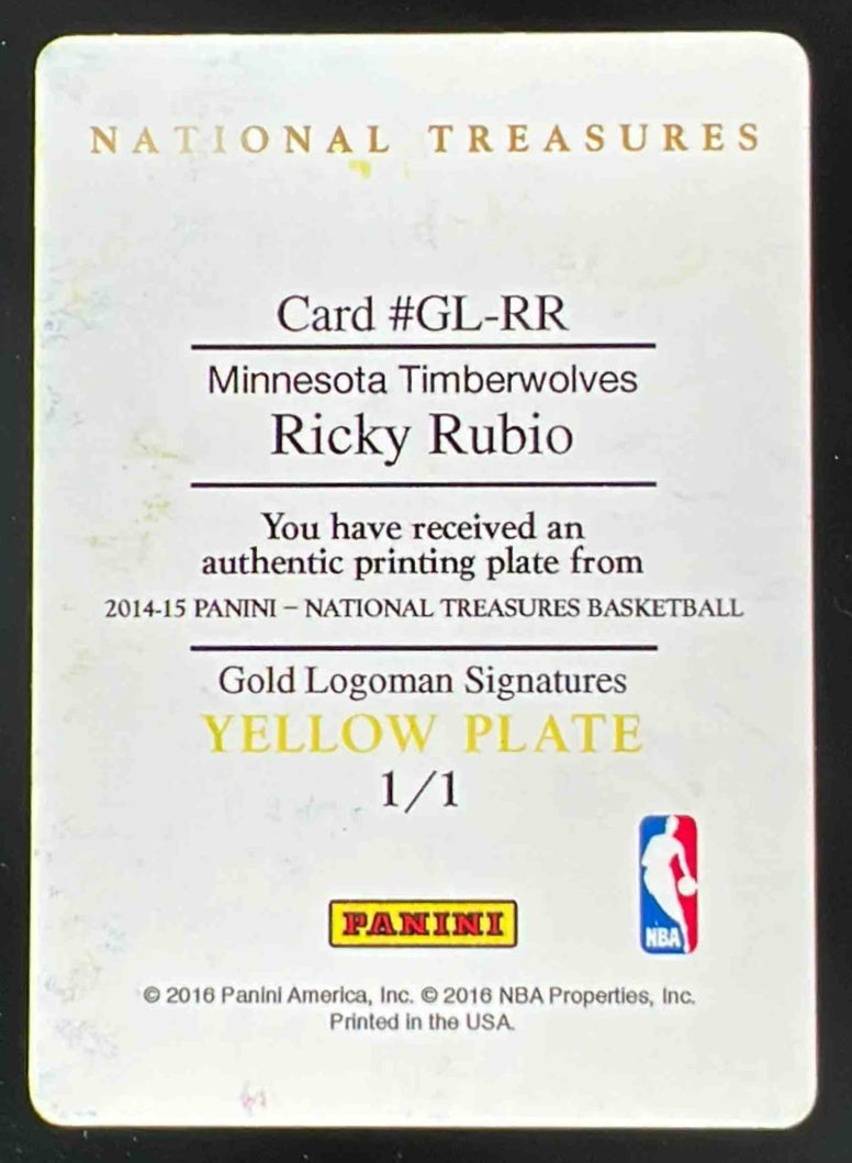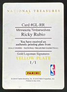 2014 National Treasures Printing Plate Yellow #GL-RR Ricky Rubio 1/1