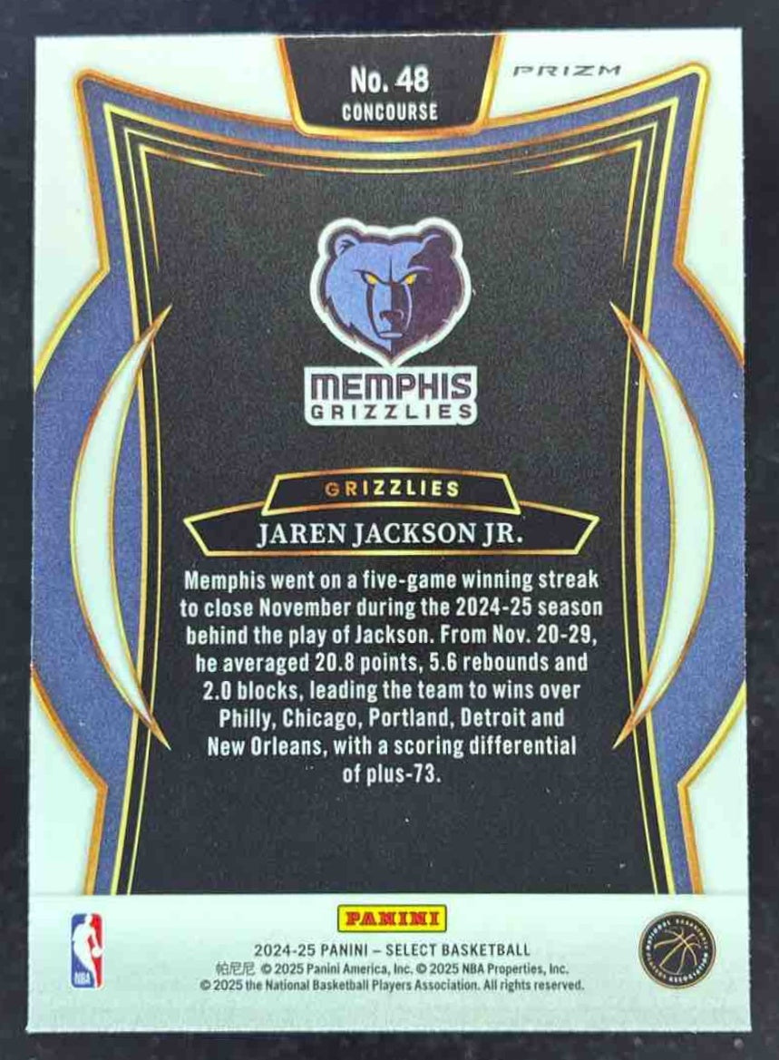 2024-25 Panini Select Concourse Zebra Prizm #48 Jaren Jackson Jr.