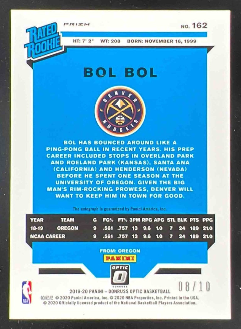 2019 Donruss Optic Rated Rookies Purple Velocity FOTL #162 Bol Bol RC Auto /10