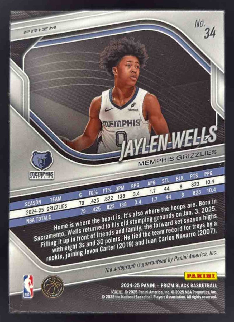 2024-25 Panini Prizm Black Autographs Silver Prizms #34 Jaylen Wells RC Auto
