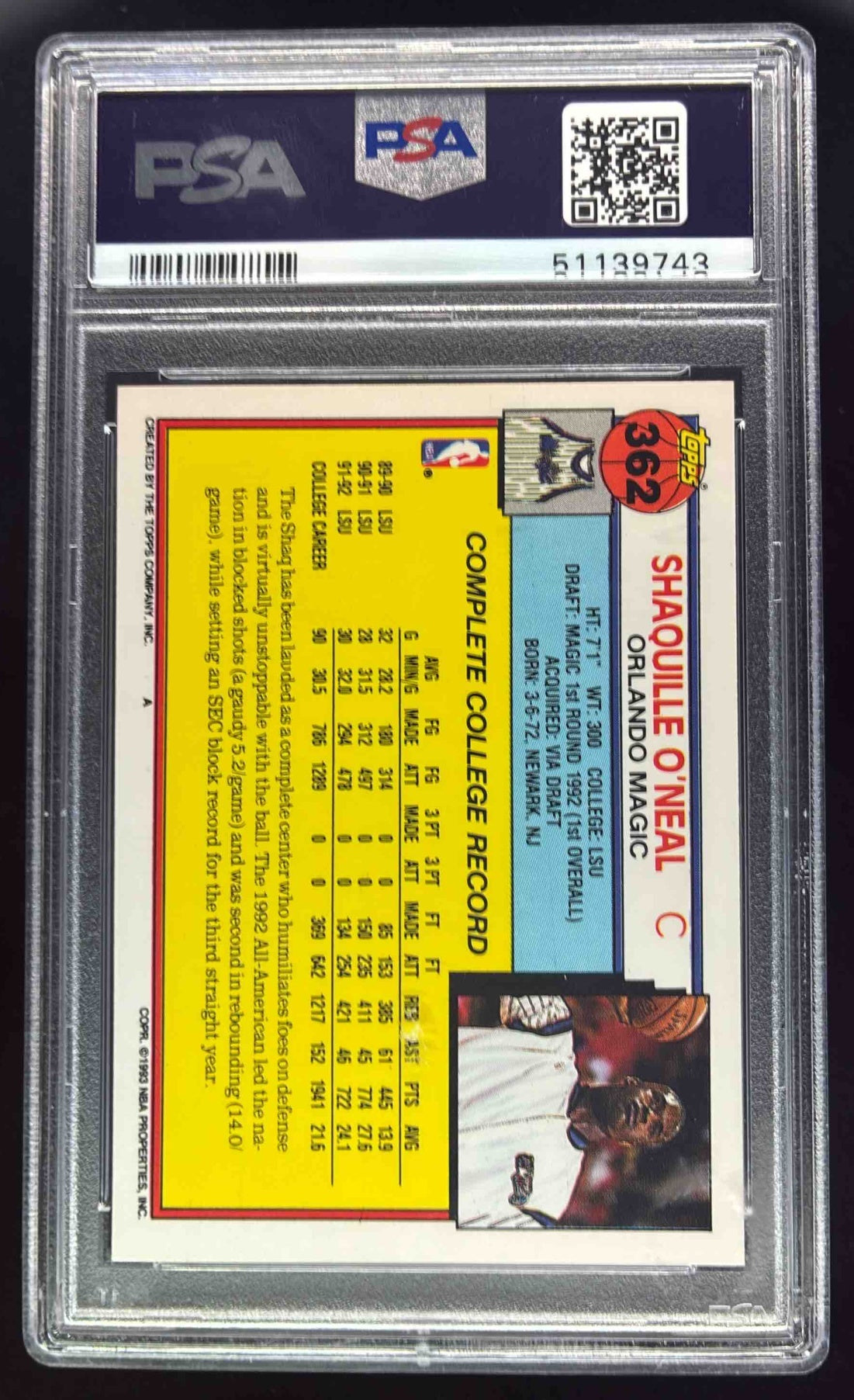 1992-93 Topps #362 Shaquille O'Neal RC Rookie PSA 10