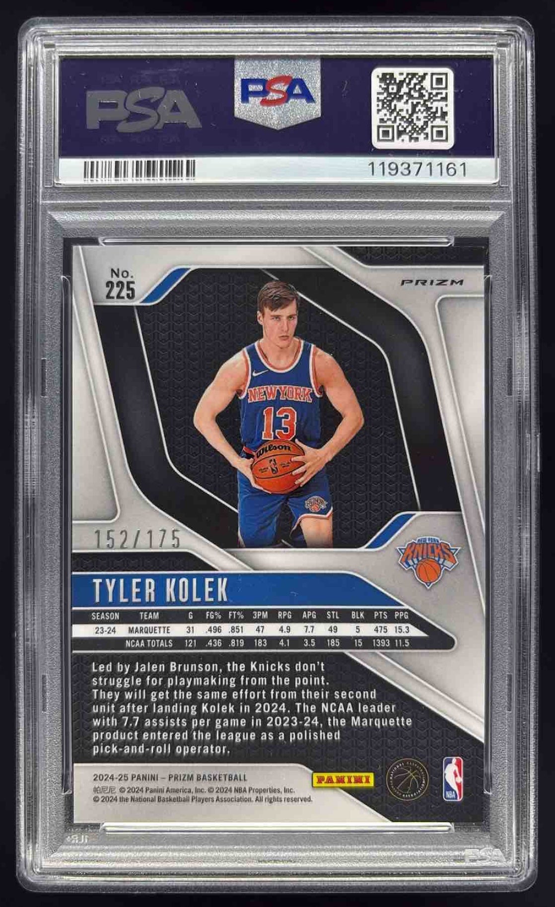 2024-25 Panini Prizm White Prizm #225 Tyler Kolek RC /175 PSA 10