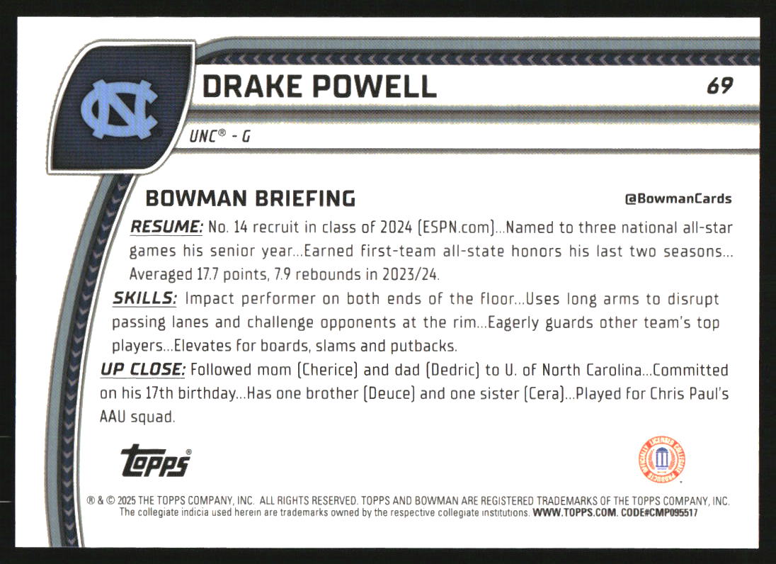 2024-25 Bowman University Chrome Blue Shimmer Refractor #69 Drake Powell /35