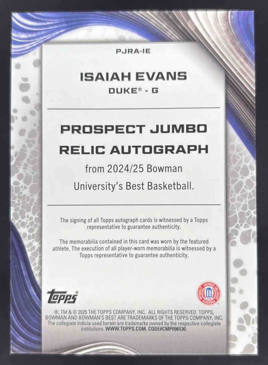 2024 Bowman's Best University Jumbo Relic Black #PJRA-IE Isaiah Evans Auto /10