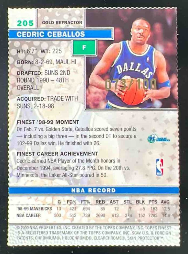 1999-00 Topps Finest Gold Refractors #205 Cedric Ceballos /100