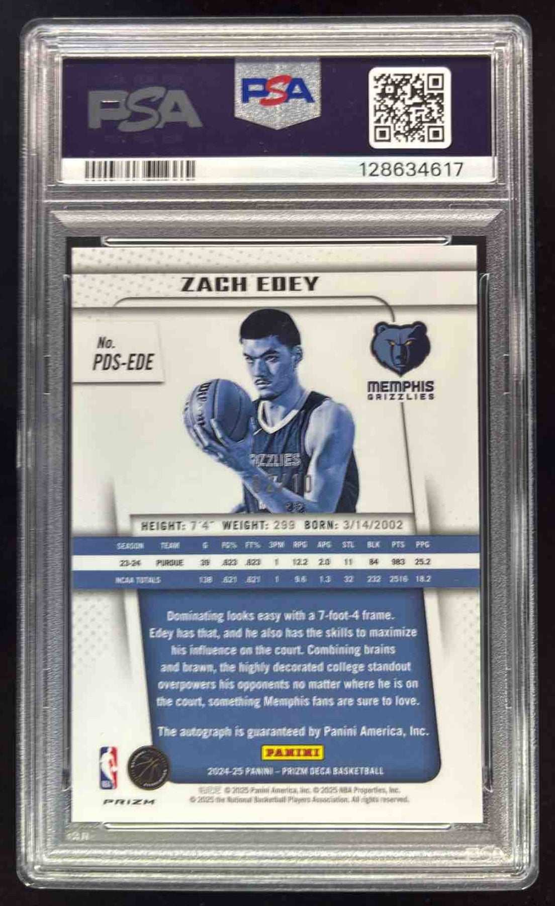 2024-25 Panini Prizm Deca Gold Shimmer FOTL #PDS-EDE Zach Edey RC Auto /10 PSA 9