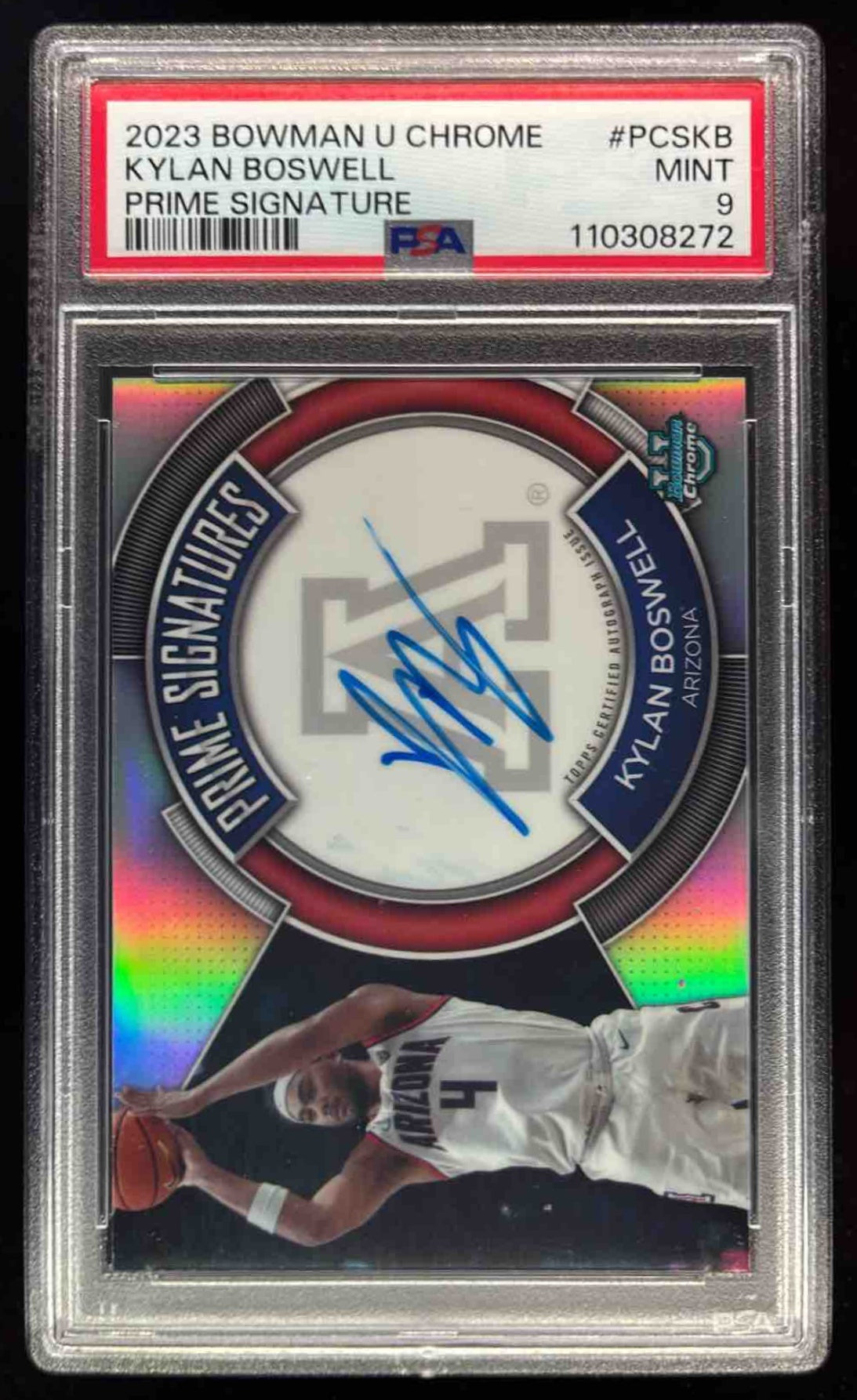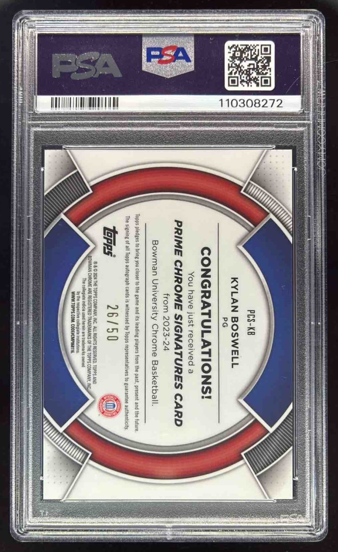 2023-24 Bowman University Chrome Prime Chrome Kylan Boswell Auto /50 PSA 9