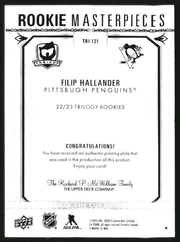 2022-23 The Cup Printing Plates Trilogy Black Filip Hallander RC Rookie 1/1