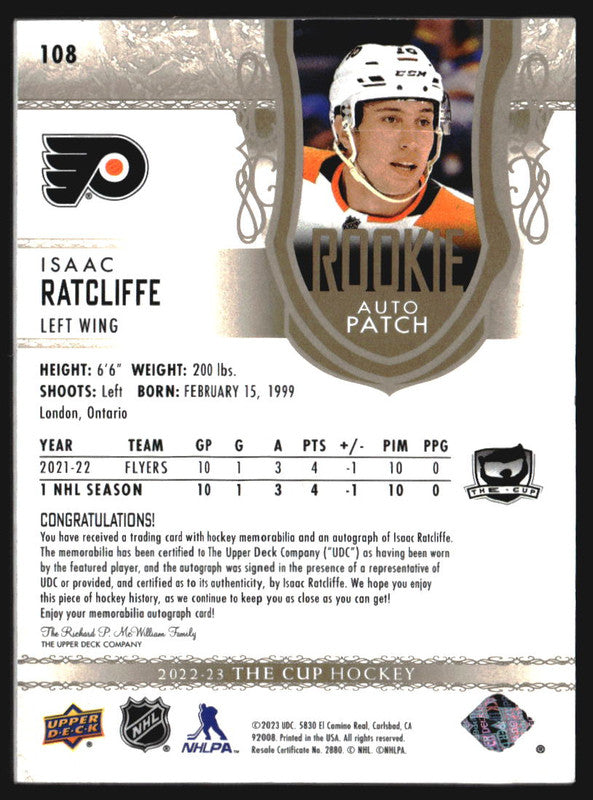 2022-23 The Cup Gold #108 Isaac Ratcliffe Rookie Jersey Autograph RC Auto /24