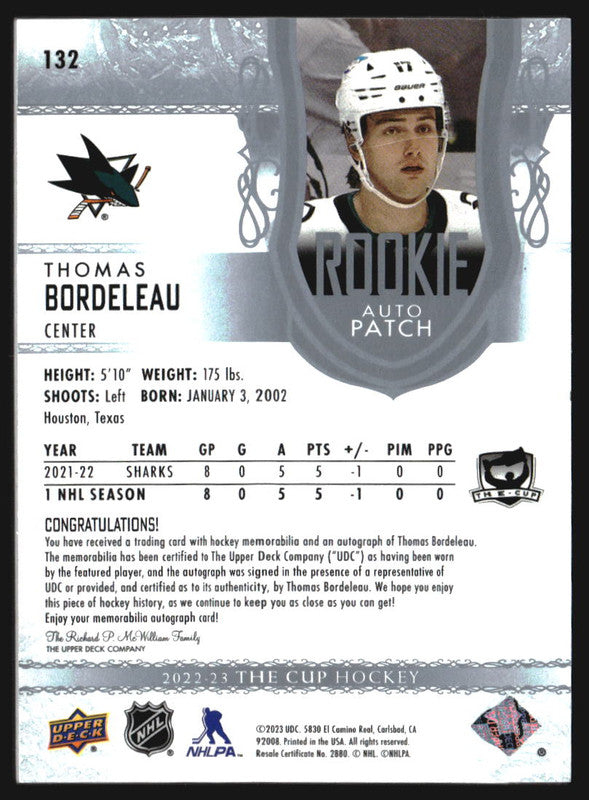 2022-23 The Cup #132 Thomas Bordeleau Rookie Jersey Autograph RC Auto /249