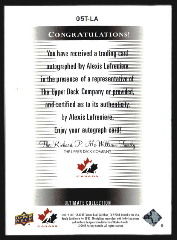 2019 Ultimate Collection '05 Ultimate Signature Alexis LaFreniere Autograph Auto