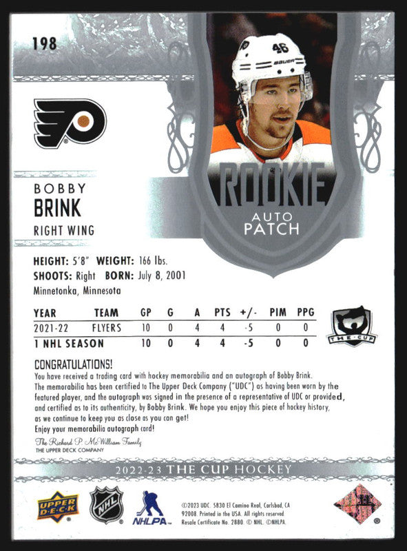 2022-23 The Cup #198 Bobby Brink Rookie Jersey Autograph RC Auto /249