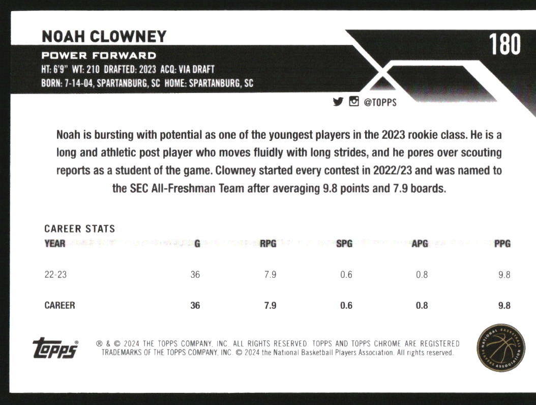 2023-24 Topps Chrome Black Refractors #180 Noah Clowney RC /10