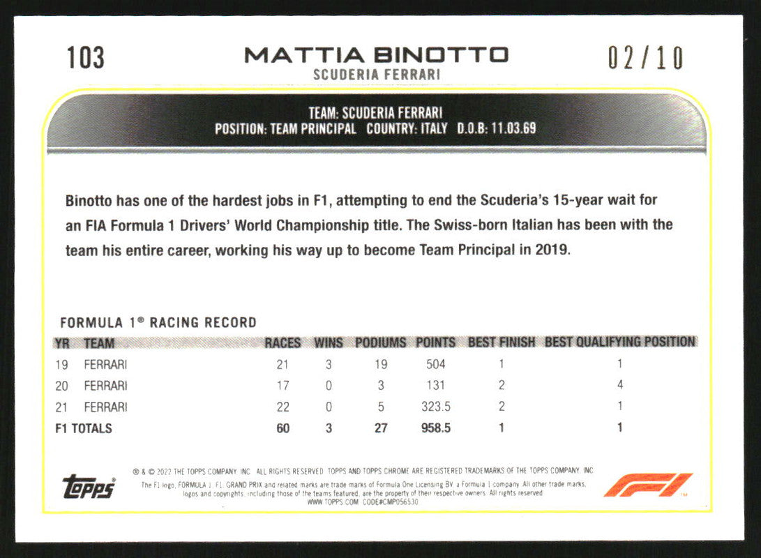 2022 Topps Chrome Sapphire Formula 1 Purple Refractors #103 Mattia Binotto /10