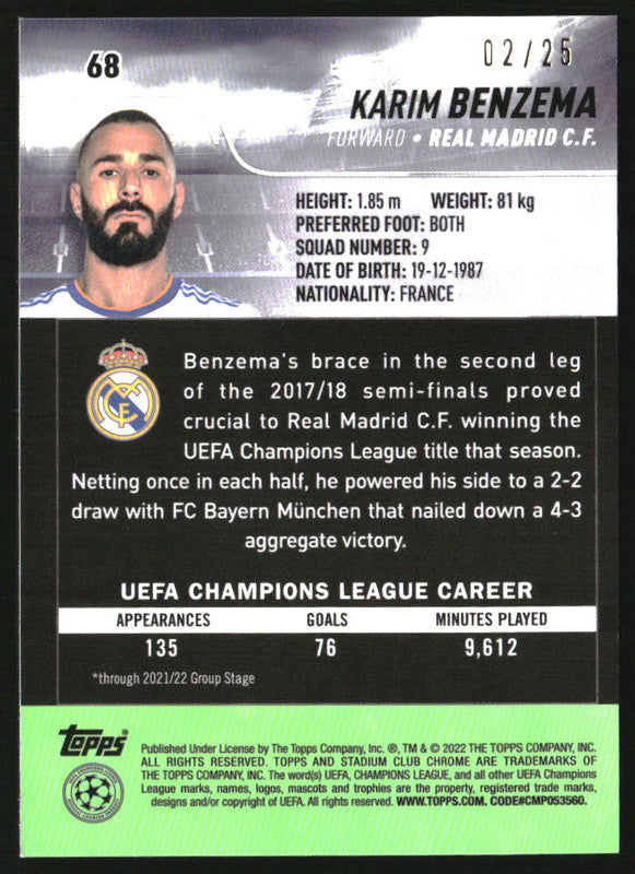 2021-22 Stadium Club Chrome UEFA Champions League Orange Wave Karim Benzema /25