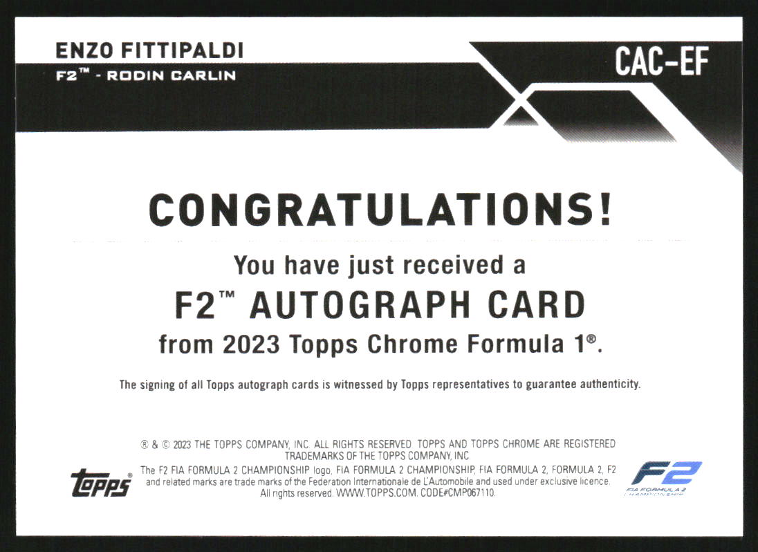 2023 Topps Chrome Formula 1 Autograph #CACEF Enzo Fittipaldi Auto