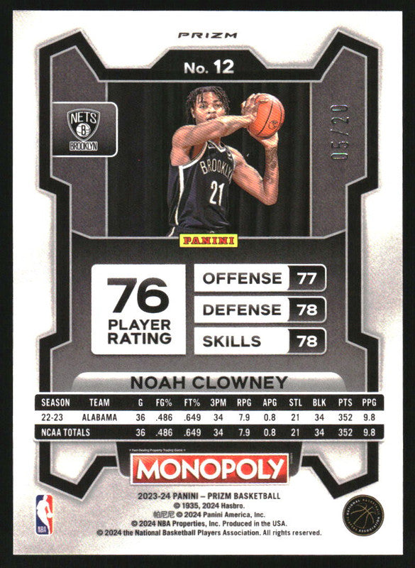 2023-24 Panini Prizm Monopoly Green Millionaire Shimmer #12 Noah Clowney RC /20