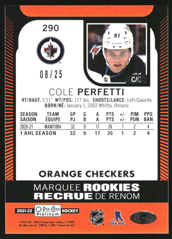 2021-22 O-Pee-Chee Platinum Orange Checkers #290 Cole Perfetti RC /25