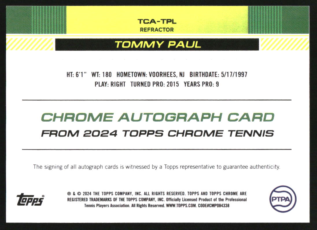 2024 Topps Chrome Tennis Autographs II Refractors #TCATPL Tommy Paul Auto /99