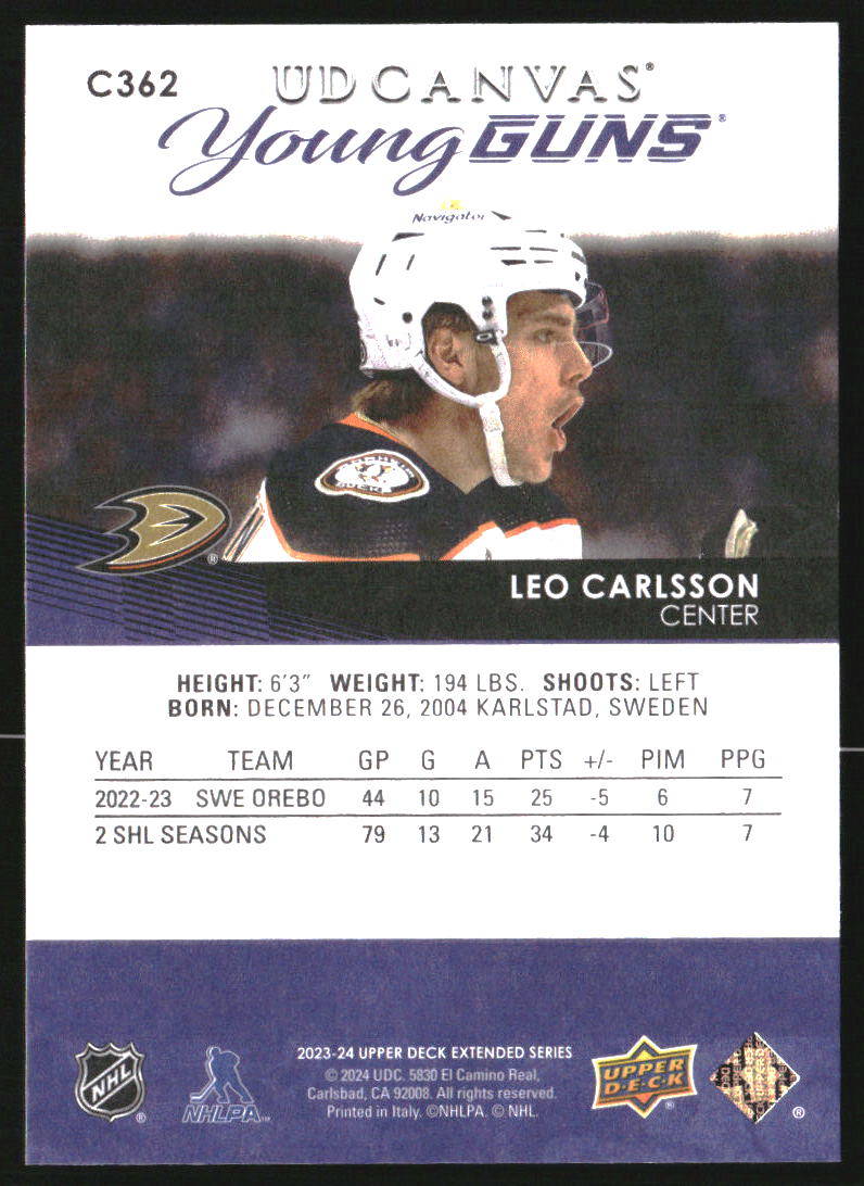2023-24 Upper Deck UD Canvas #C362 Leo Carlsson Young Guns RC Rookie