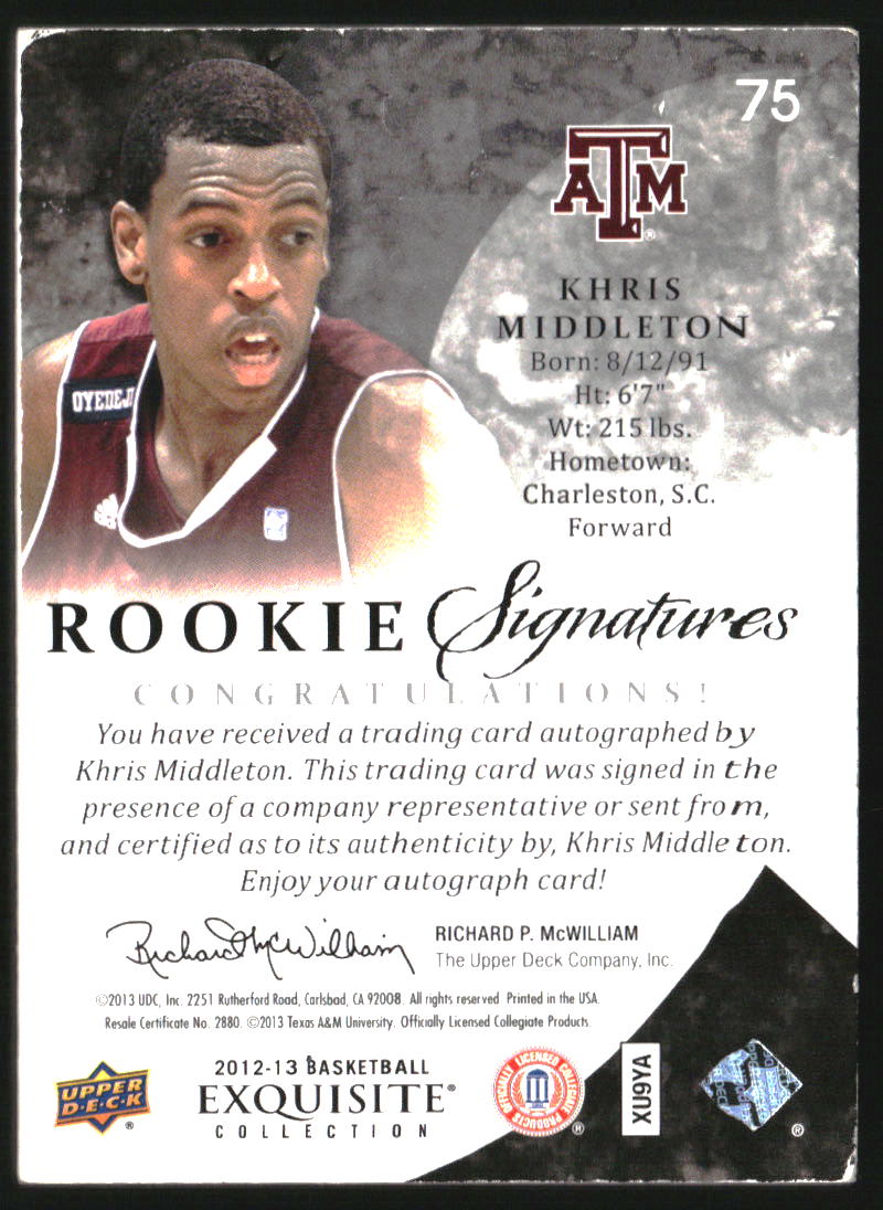 2012-13 Exquisite Collection #75 Khris Middleton Rookie Autograph RC Auto /199