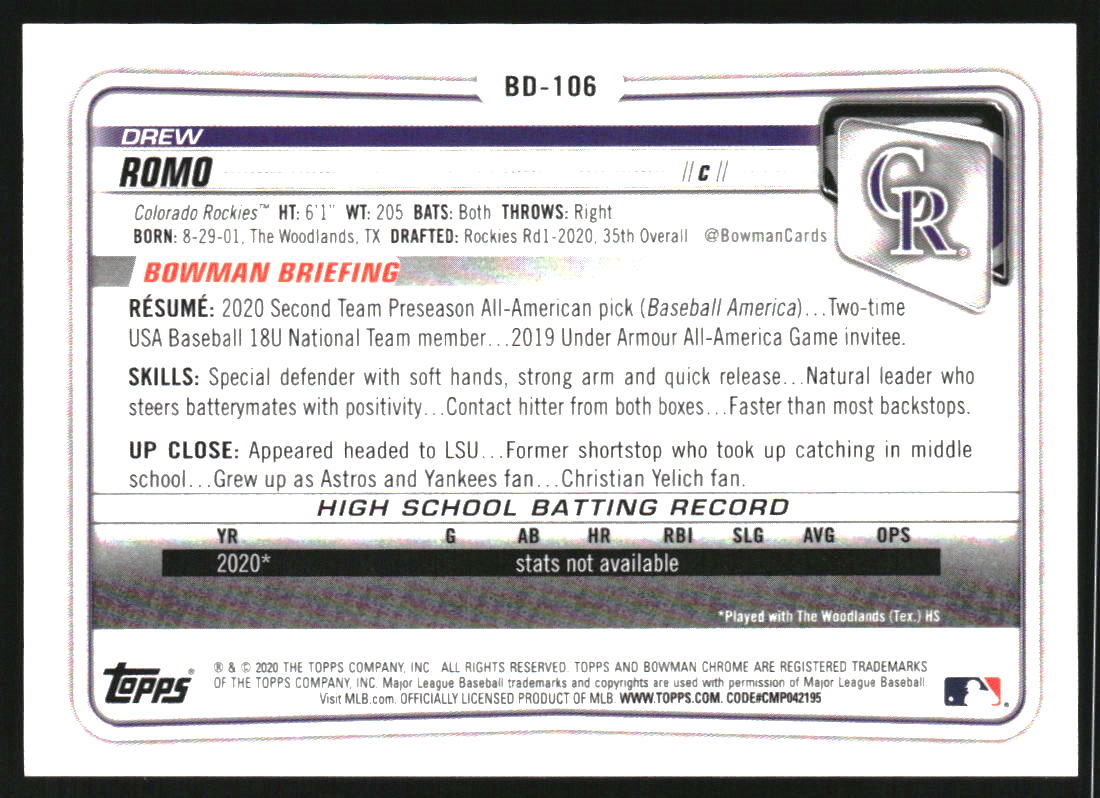 2020 Bowman Chrome Draft Gold Refractors #BD106 Drew Romo RC /50