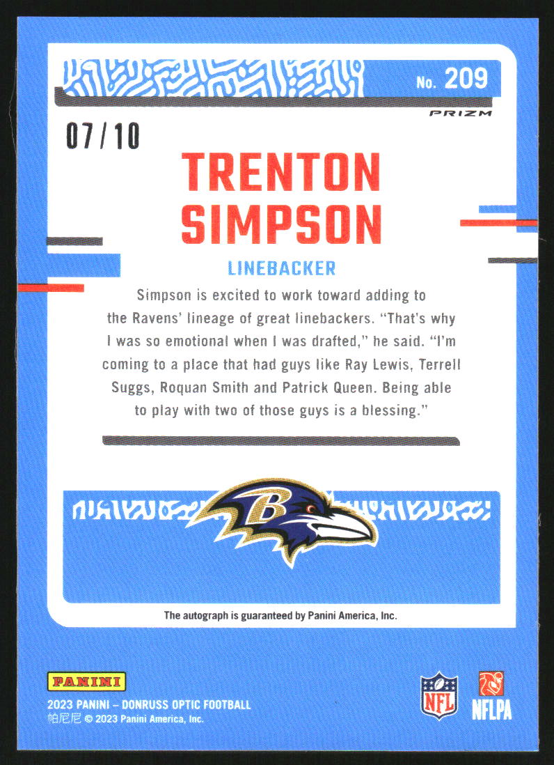 2023 Donruss Optic Rated Rookies Autograph Gold #209 Trenton Simpson RC Auto /10