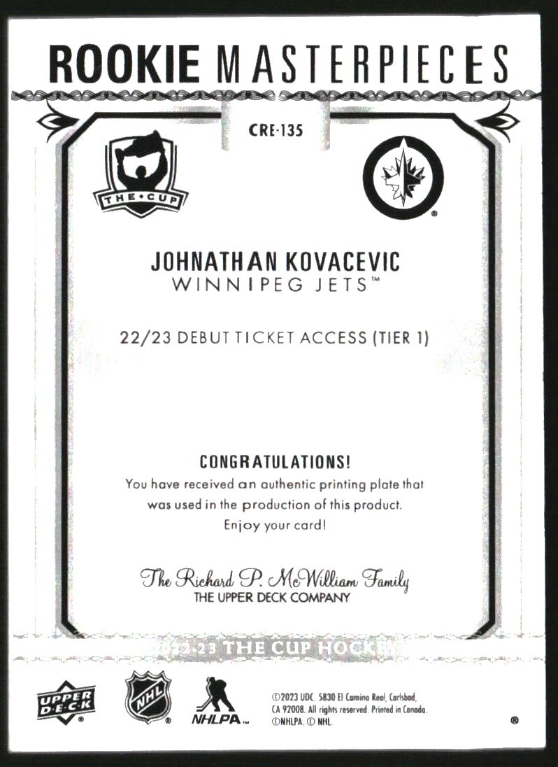 2022 The Cup Printing Plates Black Rookie Masterpiece Johnathan Kovacevic RC 1/1