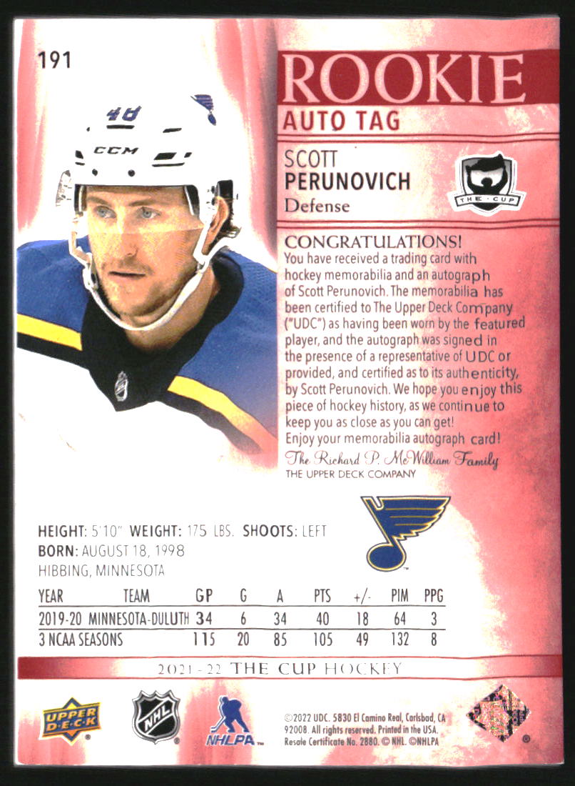 2021-22 The Cup Red #191 Scott Perunovich Rookie Autograph Tag RC Auto /4
