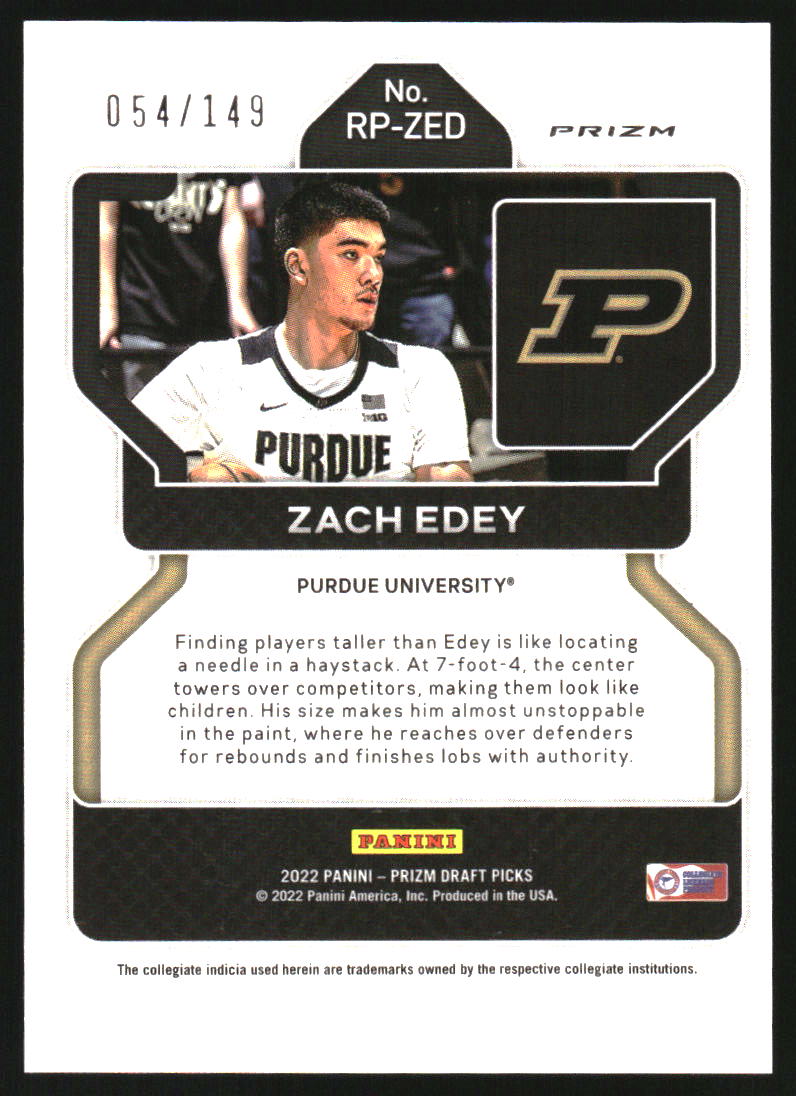 2022-23 Panini Prizm Draft Rated Prospect Prizms Purple Ice Zach Edey RC /149