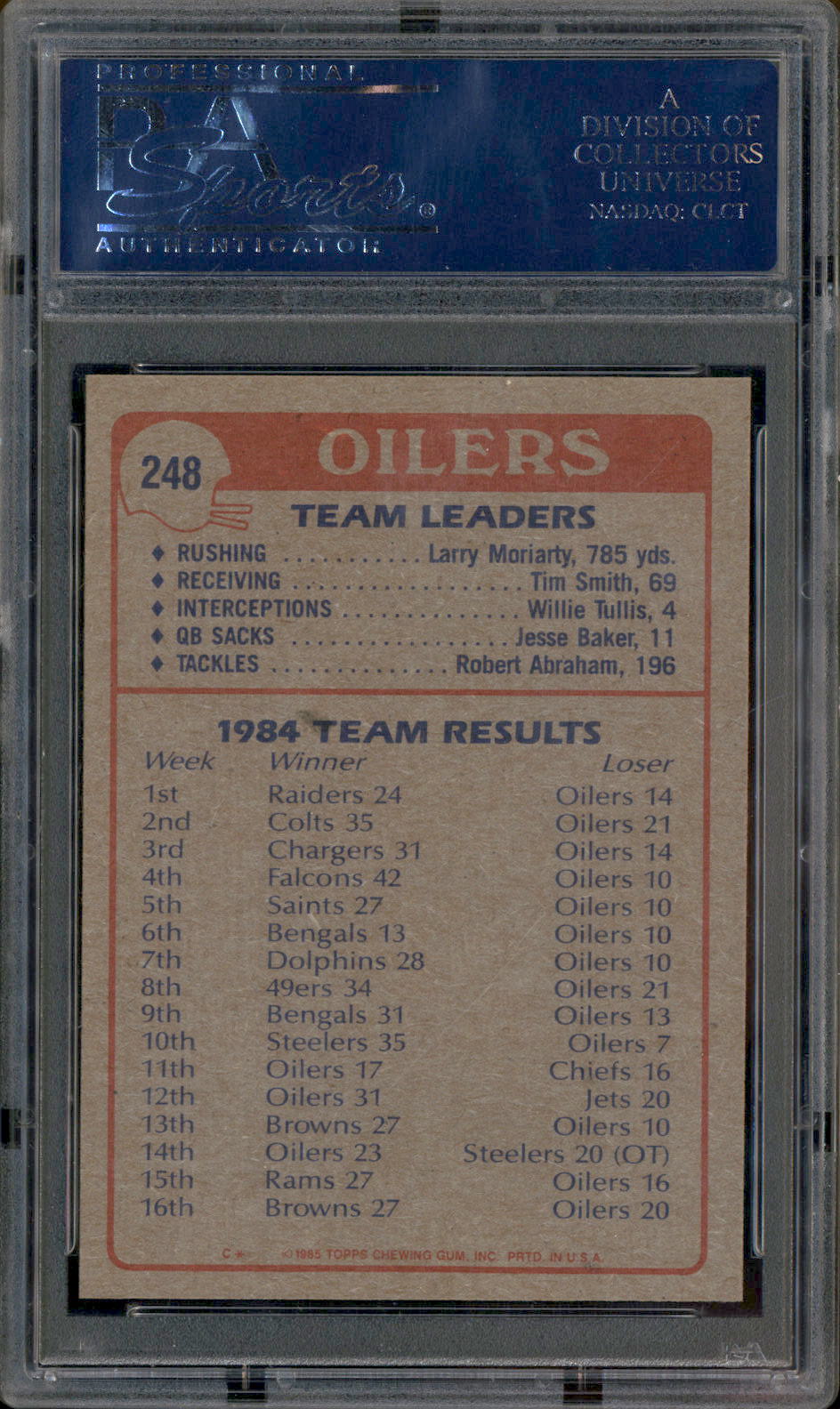 1985 Topps #248 Oilers Team Leaders Larry Moriarty PSA 9