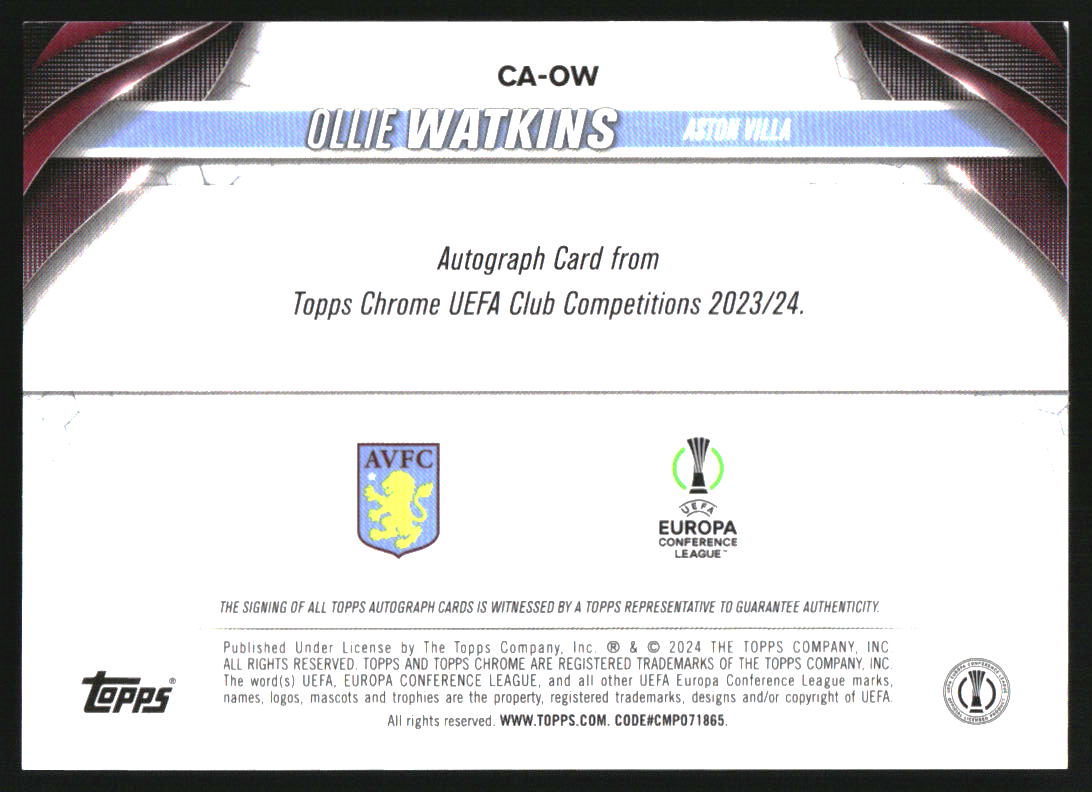 2023-24 Topps Chrome UEFA Club Chrome Auto Toppsfractors Ollie Watkins /52
