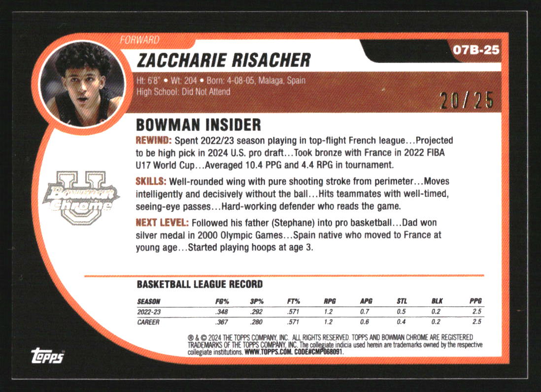 2023-24 Bowman Chrome University '07-08 Bowman Orange Zaccharie Risacher /25