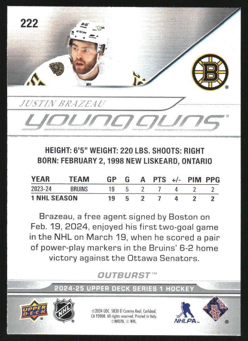 2024-25 Upper Deck Outburst Silver #222 Justin Brazeau Young Guns RC Rookie