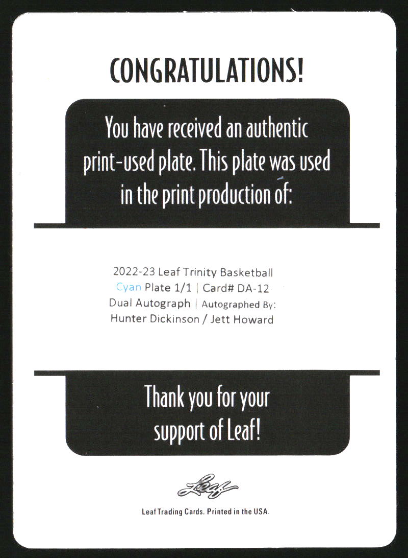 2022 Leaf Trinity Dual Auto Printing Plate Cyan Hunter Dickinson Jett Howard 1/1